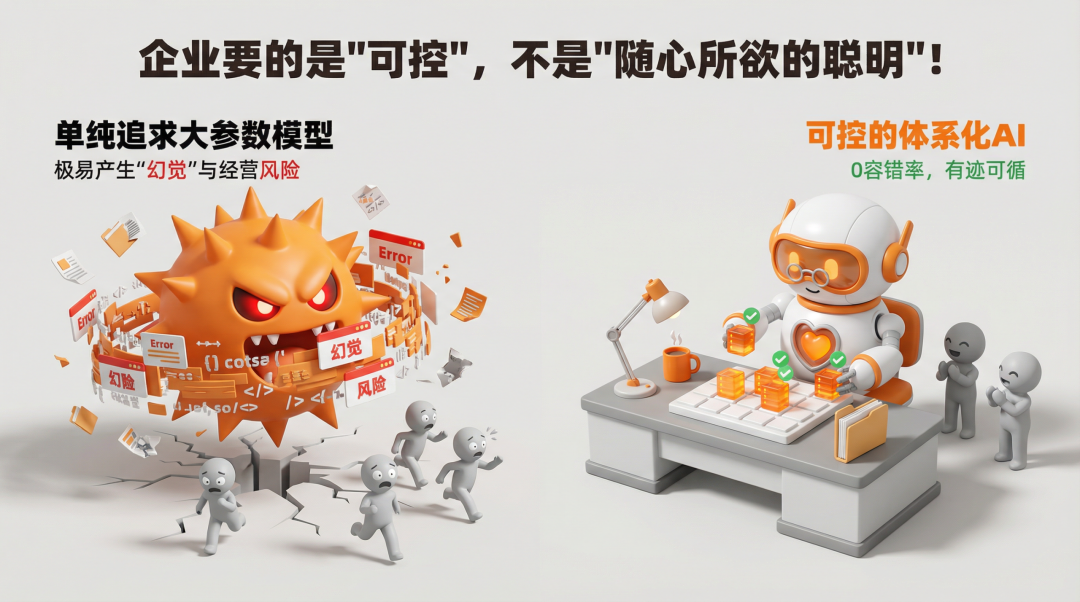 消費(fèi)場(chǎng)景中,模型的失誤頂多影響體驗(yàn),而**企業(yè)場(chǎng)景的容錯(cuò)率近乎為零**。合同關(guān)鍵字錯(cuò)誤、庫(kù)存預(yù)測(cè)偏差、財(cái)務(wù)指標(biāo)理解失誤,都可能引發(fā)難以承擔(dān)的經(jīng)營(yíng)風(fēng)險(xiǎn)。企業(yè)最怕的不是AI能力不足,而是AI隨心所欲“亂來(lái)”,模型“幻覺(jué)”在企業(yè)場(chǎng)景中,早已不是單純的技術(shù)問(wèn)題,而是實(shí)實(shí)在在的經(jīng)營(yíng)風(fēng)險(xiǎn)。