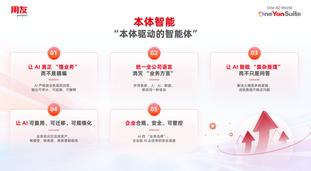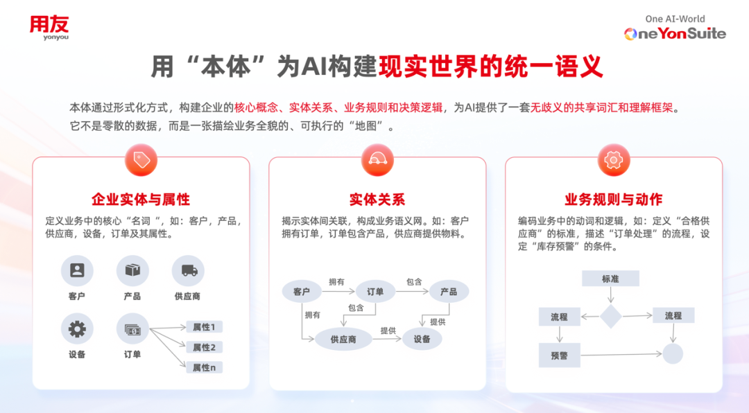 也正是在這樣的背景下,企業(yè)對(duì)AI的熱情與焦慮并存。許多管理者希望通過AI實(shí)現(xiàn)降本增效,但企業(yè)級(jí)AI的落地,絕非簡(jiǎn)單接入一個(gè)大模型,更非追逐一時(shí)熱點(diǎn)。它是一項(xiàng)必須依托于工程化體系、業(yè)務(wù)規(guī)則和平臺(tái)能力的系統(tǒng)工程。基于用友YonSuite的長(zhǎng)期實(shí)踐,我們得出一個(gè)核心判斷:要讓AI真正跨越企業(yè)應(yīng)用的“最后一公里”,關(guān)鍵不在于讓它更“能說會(huì)道”,而在于讓它真正懂業(yè)務(wù)、守規(guī)則、能協(xié)同。而實(shí)現(xiàn)這一目標(biāo)的核心抓手,正是本體驅(qū)動(dòng)的智能體(Ontology-driven Agent)。