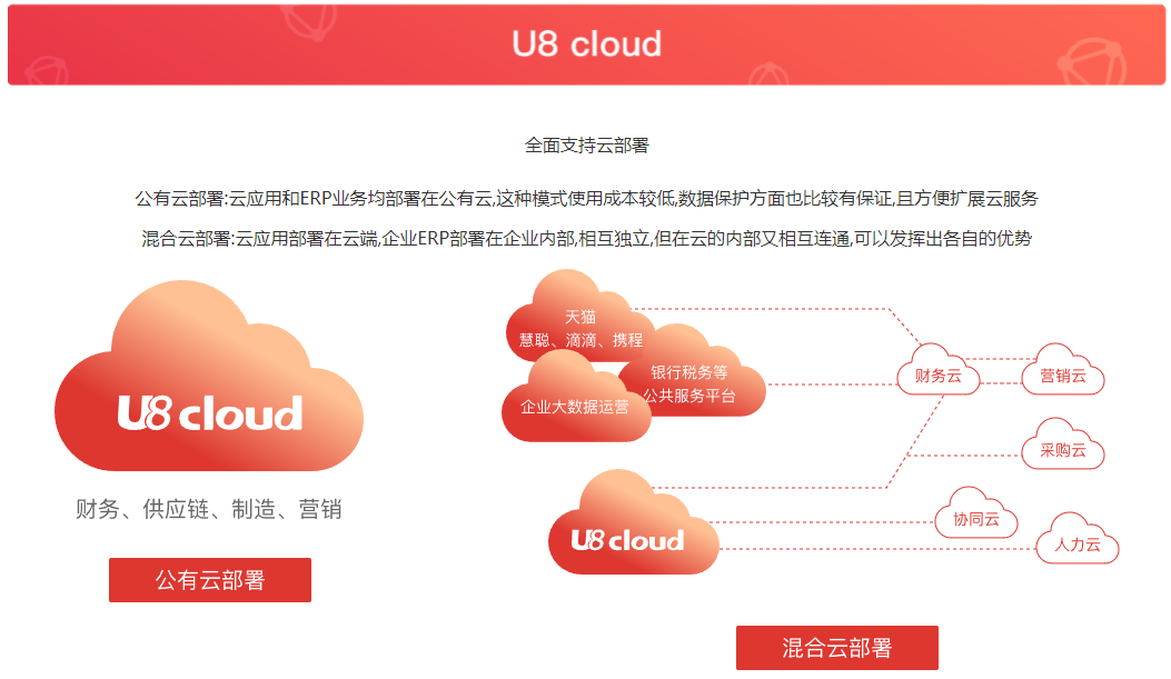 混合云部署:云應(yīng)用部署在云端,企業(yè)ERP部署在企業(yè)內(nèi)部,相互獨(dú)立,但在云的內(nèi)部又相互連通,可以發(fā)揮出各自的優(yōu)勢(shì)