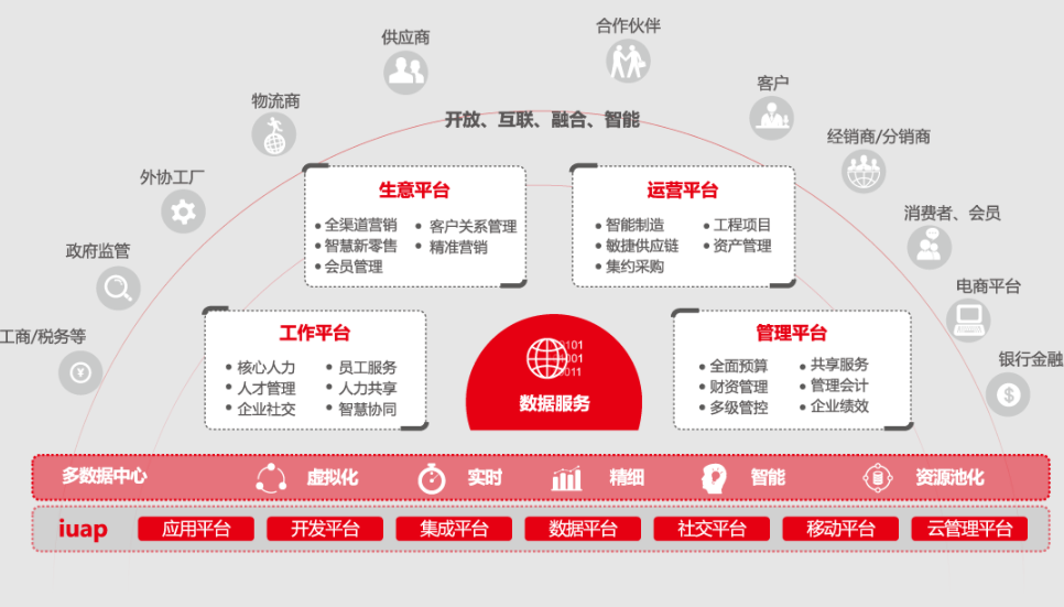 用友NC Cloud基于iuap社會化商業(yè)應(yīng)用基礎(chǔ)平臺,圍繞人、財(cái)、物、客四大管控對象,幫助企業(yè)構(gòu)建面向社會化商業(yè)的工作平臺、管理平臺、運(yùn)營平臺和生意平臺,連接全球、全網(wǎng)、全域資源,賦能企業(yè)實(shí)現(xiàn)基于技術(shù)驅(qū)動的業(yè)務(wù)變革和商業(yè)創(chuàng)新。