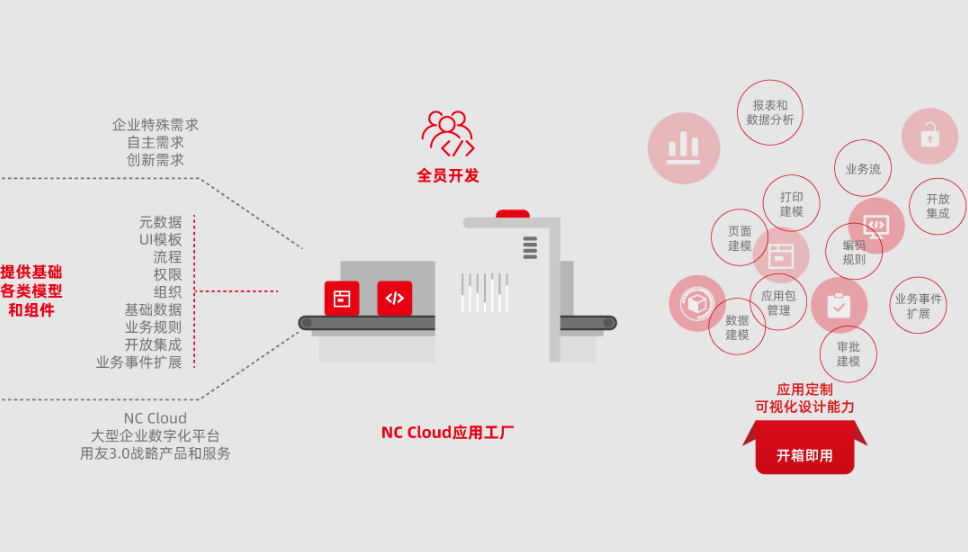 用友NC Cloud應(yīng)用工廠作為零代碼開發(fā)平臺,為企業(yè)提供了各類基礎(chǔ)模型和組件(如元數(shù)據(jù)、UI模板、流程、權(quán)限、組織、基礎(chǔ)數(shù)據(jù)、業(yè)務(wù)規(guī)則、開放集成、業(yè)務(wù)事件擴(kuò)展等),支持全員開發(fā),真正開箱即用,基于個性化定制開發(fā)的模式,滿足企業(yè)在數(shù)智化時(shí)代的自主創(chuàng)新需求。