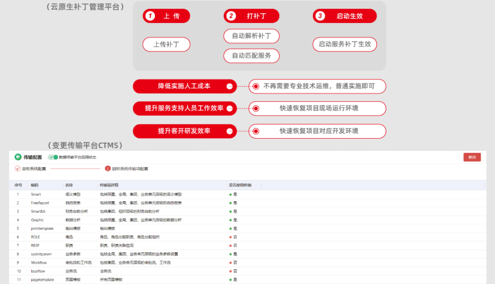 用友NC Cloud提供了可助力企業(yè)在云模式下高效運(yùn)維的B類工具,通過變更傳輸平臺CTMS、云原生補(bǔ)丁管理平臺,保證業(yè)務(wù)系統(tǒng)的連續(xù)、可靠、一致性,同時(shí)縮短項(xiàng)目工期,提升實(shí)施、服務(wù)、客開等支持人員的交付效率 。