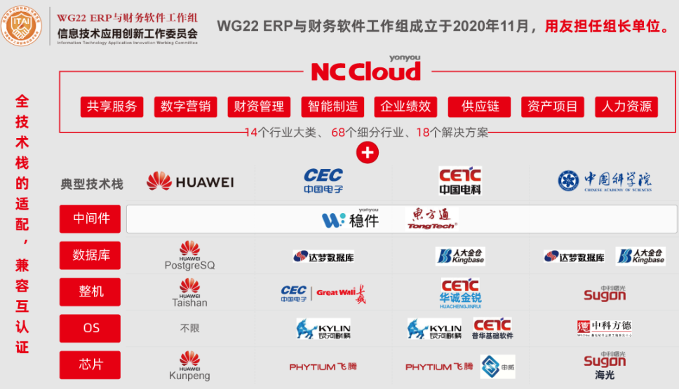 為了推動信創(chuàng)產(chǎn)業(yè)發(fā)展,用友參與了信創(chuàng)聯(lián)盟、信創(chuàng)工委會、WG22 ERP與財(cái)務(wù)軟件工作組等組織機(jī)構(gòu)。用友NC Cloud與華為鯤鵬體系和中國電子PKS體系等國內(nèi)主流的信創(chuàng)產(chǎn)品進(jìn)行全棧適配。截止2021年5月,用友NC Cloud已與近50個國產(chǎn)化產(chǎn)品實(shí)現(xiàn)兼容認(rèn)證,形成安全可信的數(shù)智化解決方案。